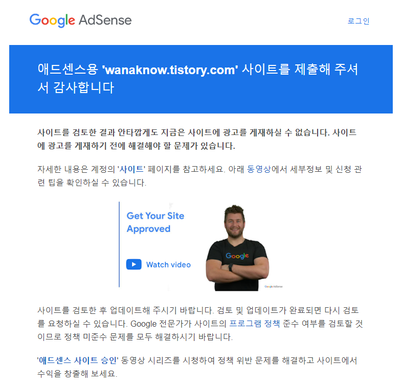 특별히 '이렇게 이렇게 하셔야 신청이 통과 됩니다!' 라는 말 없이 그냥 동영상 링크를 하나 주고 문제를 해결해 보라는 불친절한(?) 구글의 안내 대신 이리저리 검색을 해 본결과, 아무래도 내 블로그는 구글이 원하는 '양질의 컨텐츠'가 존재하는 곳은 아닌듯 하다. 또 절대적인 유입 자체가 작으니, 회사 입장에서는 돈이 될 만한 곳이 아니라는 판단이 섰는지도 모르겠다.
