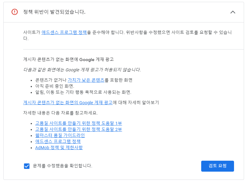 뭐 쩄든, 나는 다시 애드센스 사이트에 들어가 재심사를 신청해 두었다.