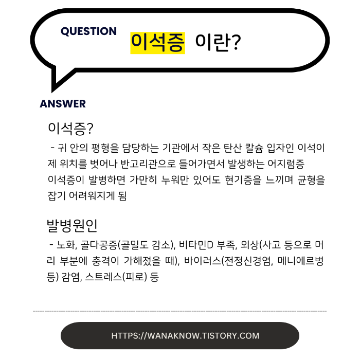 이석증은 주로 50세 이상의 중장년층에서, 남성보다는 여성에게 주로 발생하는 질환이라고 한다. 하지만 최근에는 2~30대 젊은 층에서도 많이 발생하는데, 대부분은 외상이나 스트레스성이라고 한다.
