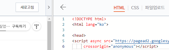 5. 4번 단계까지 마쳤다면 다시 나의 티스토리 홈으로 넘어와야 한다. 애드센스에서 복사한 코드를 티스토리에 심기 위함인데, 설정 - 스킨편집 - 오른쪽 상단에 html편집을 눌러 코드창이 열리면 <head> 아래 복사한 코드를 붙여 넣기 한 뒤 적용 버튼을 눌러주고 나오면 된다.